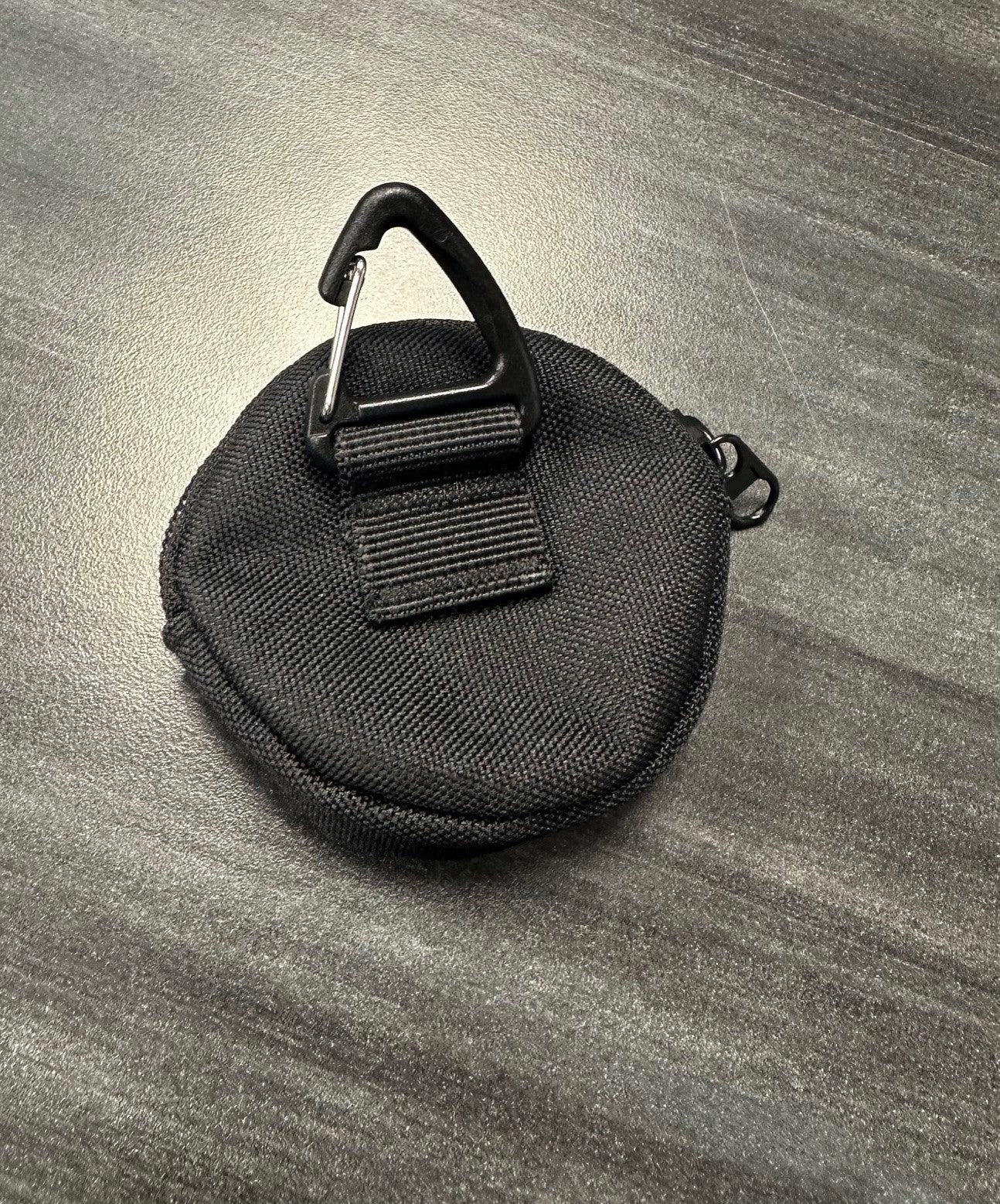 Round zipper pouch with a clip on the back to attach to a duffle bag or back pack. Includes a glass bead rosary in royal blue with St Micheal charm